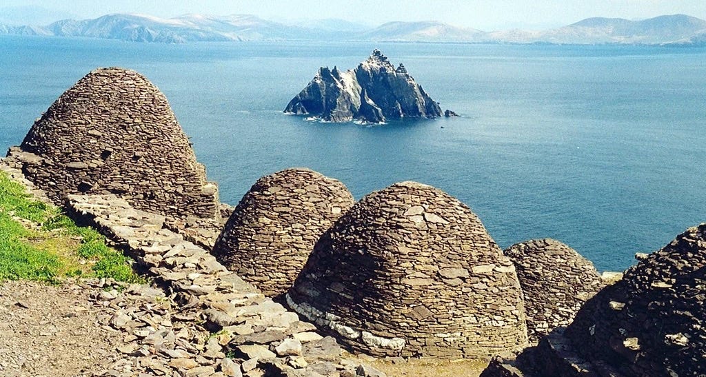 At the farthest southwest reach of County Kerry (already the most southwest county in Ireland) jut-out into the Atlantic Ocean two crags collectively called Skellig Michael (see above, p/c Arian Zwegers) so remote and mysterious that Star Wars makers filmed parts of The Force Awakens and The Last Jedi there.>But more fascinating than this is the fact that the real Christian Jedi—some of the most ascetical monks in all of Catholic history—built their beehive dwellings on these remote islands between the 6th and 8th century. The beehive huts of Catholic monks are called clocháin in Irish and bear a striking resemblance to the beehive huts of the Desert Fathers of Egypt. >Notice this article is not about Egyptian pagan influence upon the Irish, but Egyptian Christian influence upon early Irish Catholics.