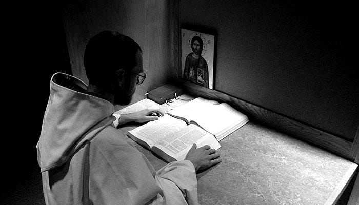 >Men,>A man reads. He reads the Scriptures. He does not rush. He does not think he knows. He listens. This is Lectio Divina. It is old. It is quiet. It comes from monks in the hills. They knew the world was loud. They knew men needed to listen.